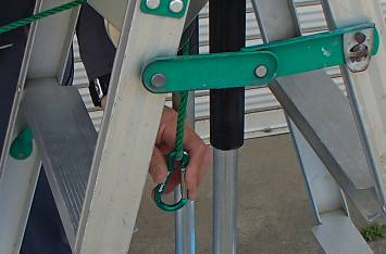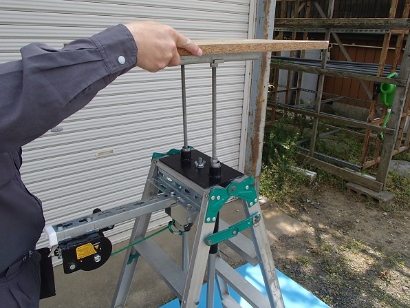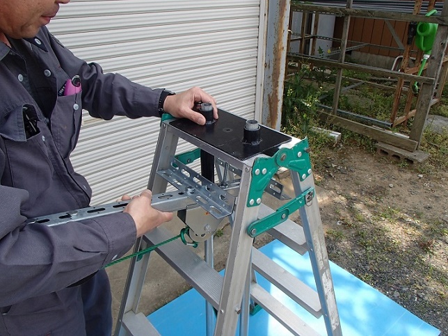 *1本体をパイプガイドの間に通して脚立天板を挟むように固定します。本体を斜めにしても通りにくい場合は、パイプガイドを少し浮かせば通ります。