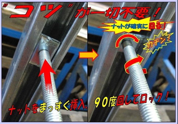 今回ご紹介する商品は、ヒシナットという中ナットに全ネジを通してねじ込むだけで固定が出来てしまう商品です。今までの作業時間のおそらく半分以下。