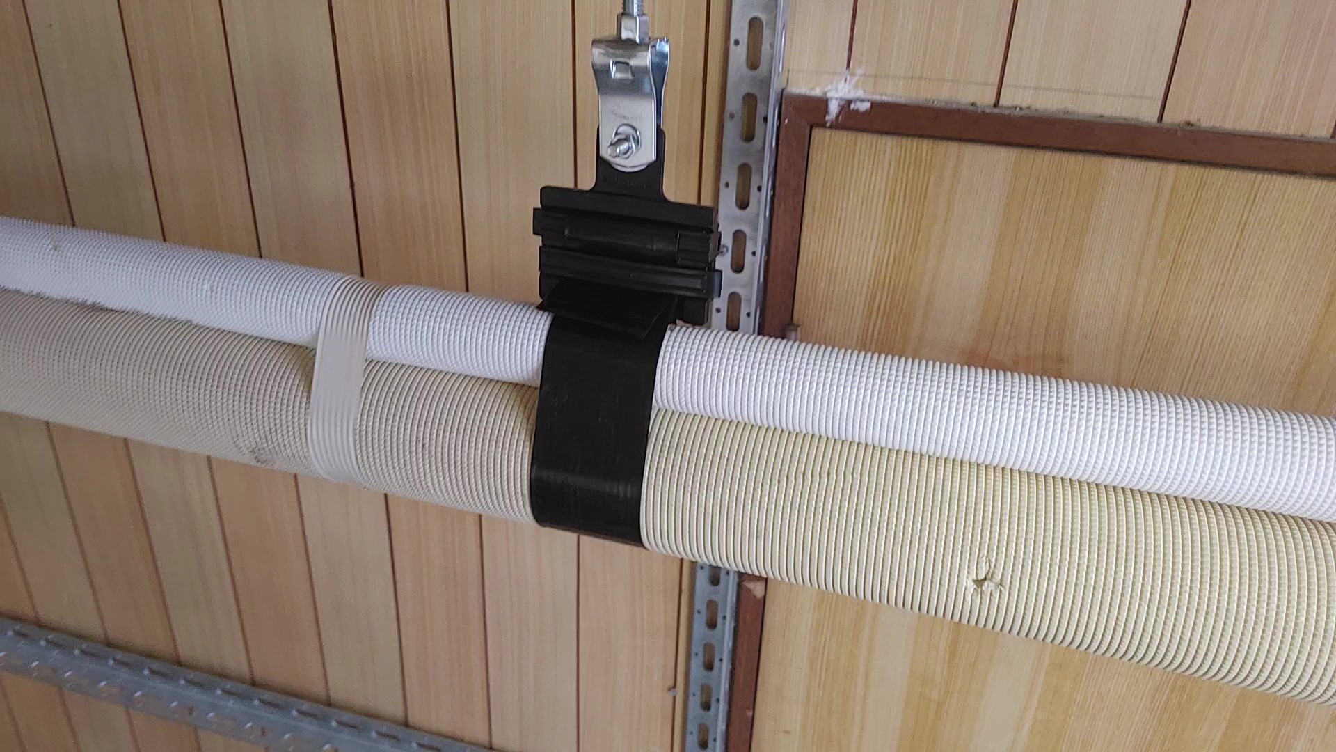 ■ 断熱ダクトや冷媒配管の保温をあまり潰さずに吊れる樹脂バンドです。