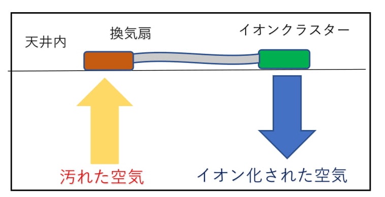 汚れた空気が、天井に設置された換気扇によって吸い上げられ、イオンクラスターを通過することでイオン化され、室内に帰るというシステムです。 つまり、換気扇は排気の役割ではなく、