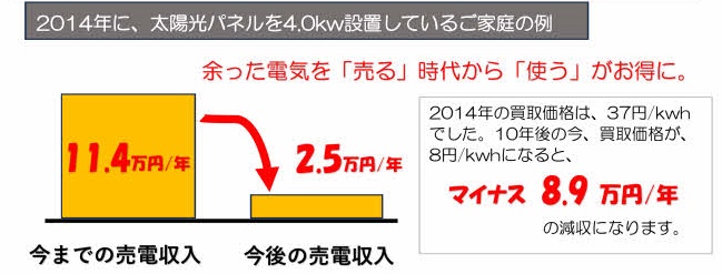 太陽光発電の固定価格買取制度は、設置後10年で終わりその後何もしなければ、下記の例のように、大幅に減収します。